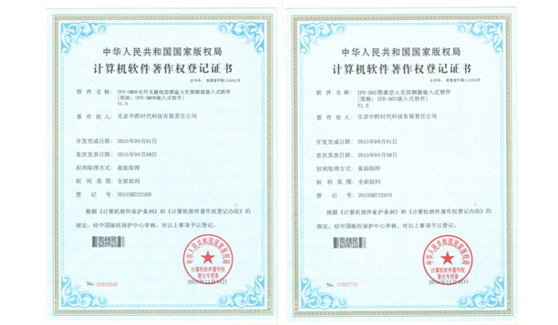2015年11月20日,公司自主研发的业内最小图像型火灾探测器和光纤光栅线型感温火灾探测器管理软件获得中华人民共和国国家版权局颁发的计算机软件著作权登记证书。标志着我公司自主知识产权获得更新的突破,充分展示了我公司高效的自主研发能力和持续的自主创新能力。